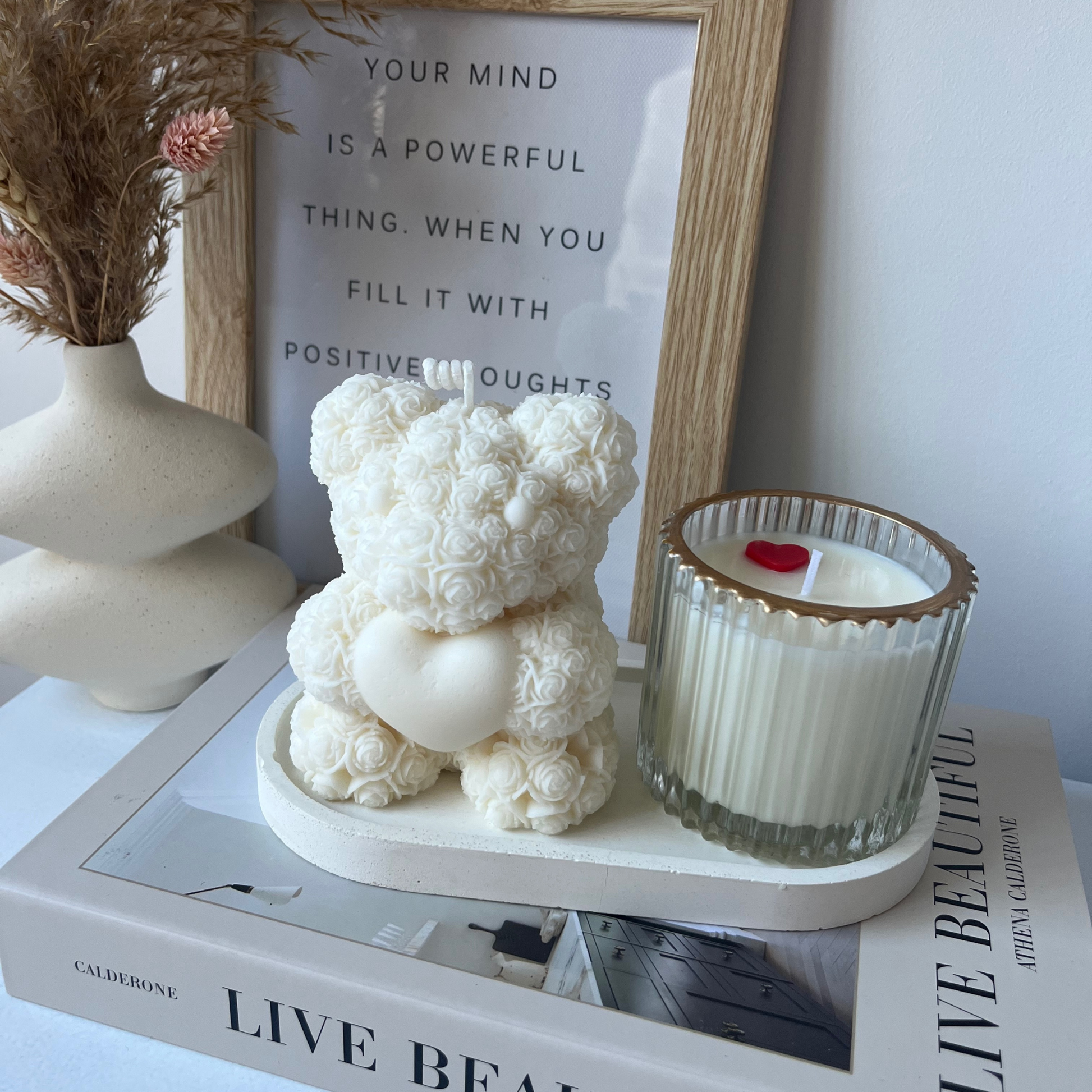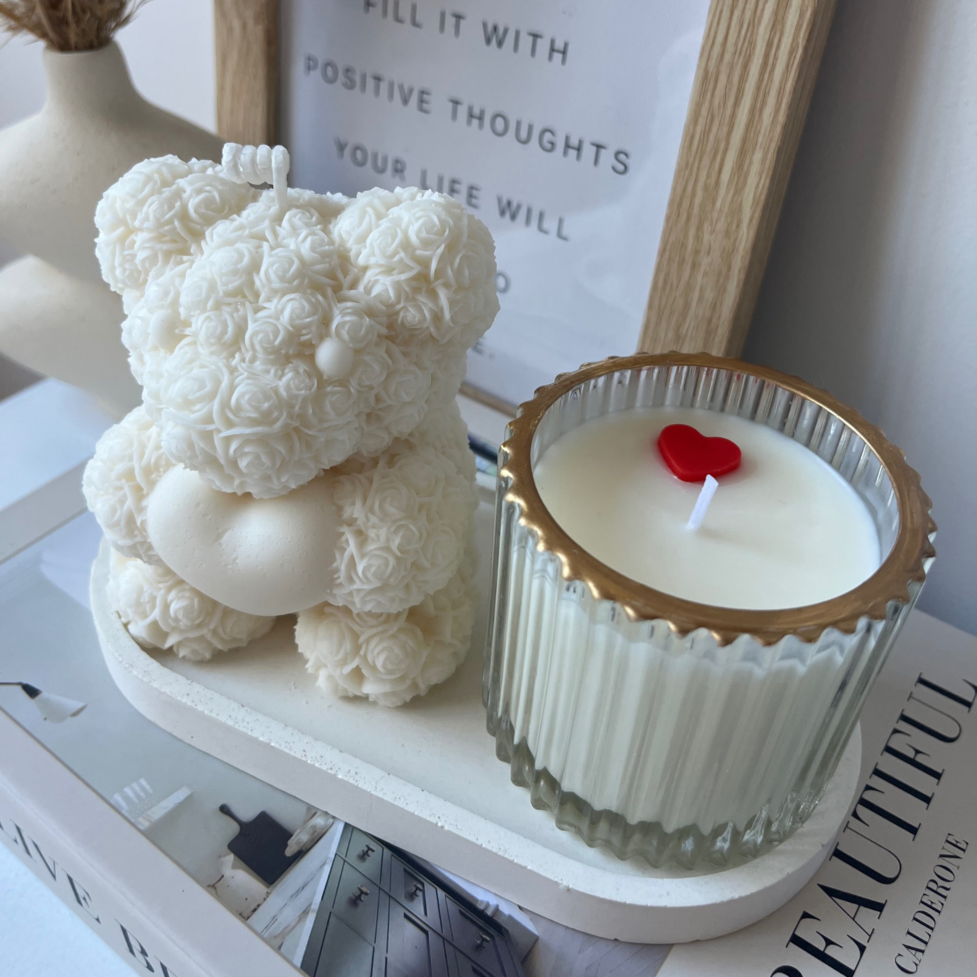 El Pack Teddy fue creado para llenar de amor cualquier espacio. Esta compuesto por la Vela Teddy – Un osito con rosas que simboliza ternura y amor incondicional. La Vela Lovers – Diseñada para acompañar momentos especiales, disponible en 3 aromas. Y la Bandeja ovalada blanca – Elegante y natural, el complemento perfecto para este dúo encantador. (Chisme es la más vendida por su versatilidad de usos)