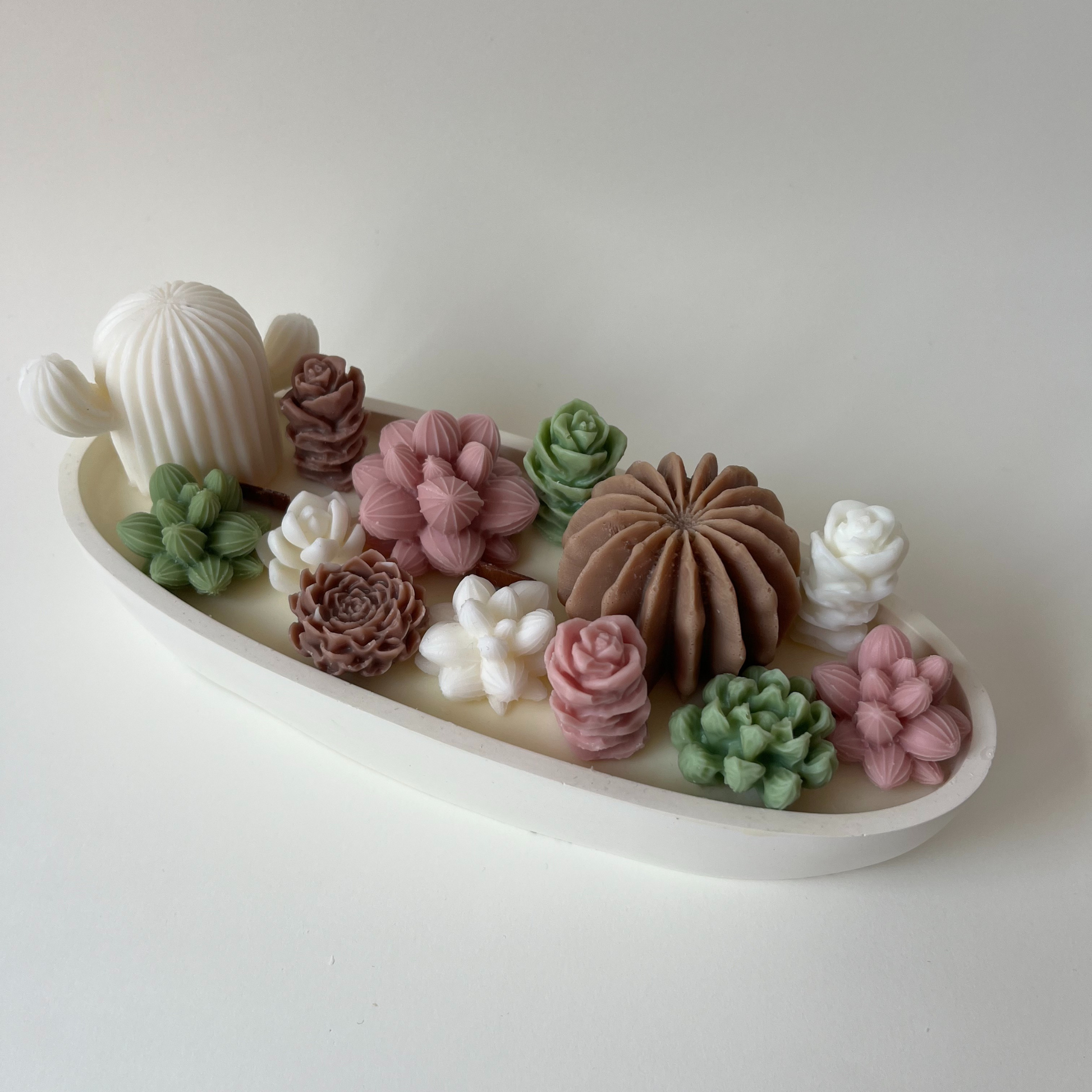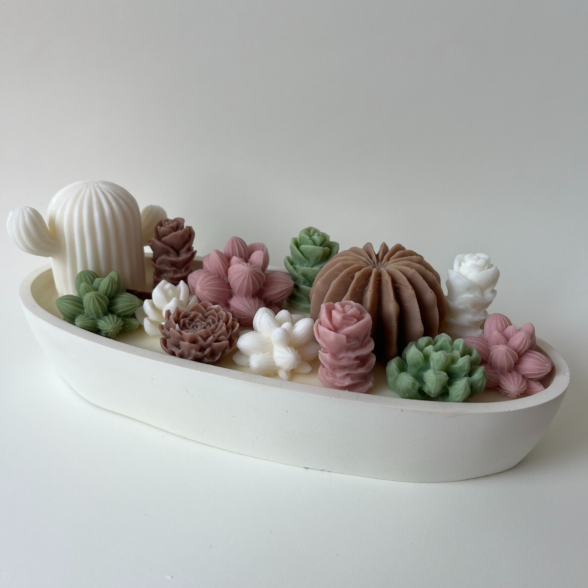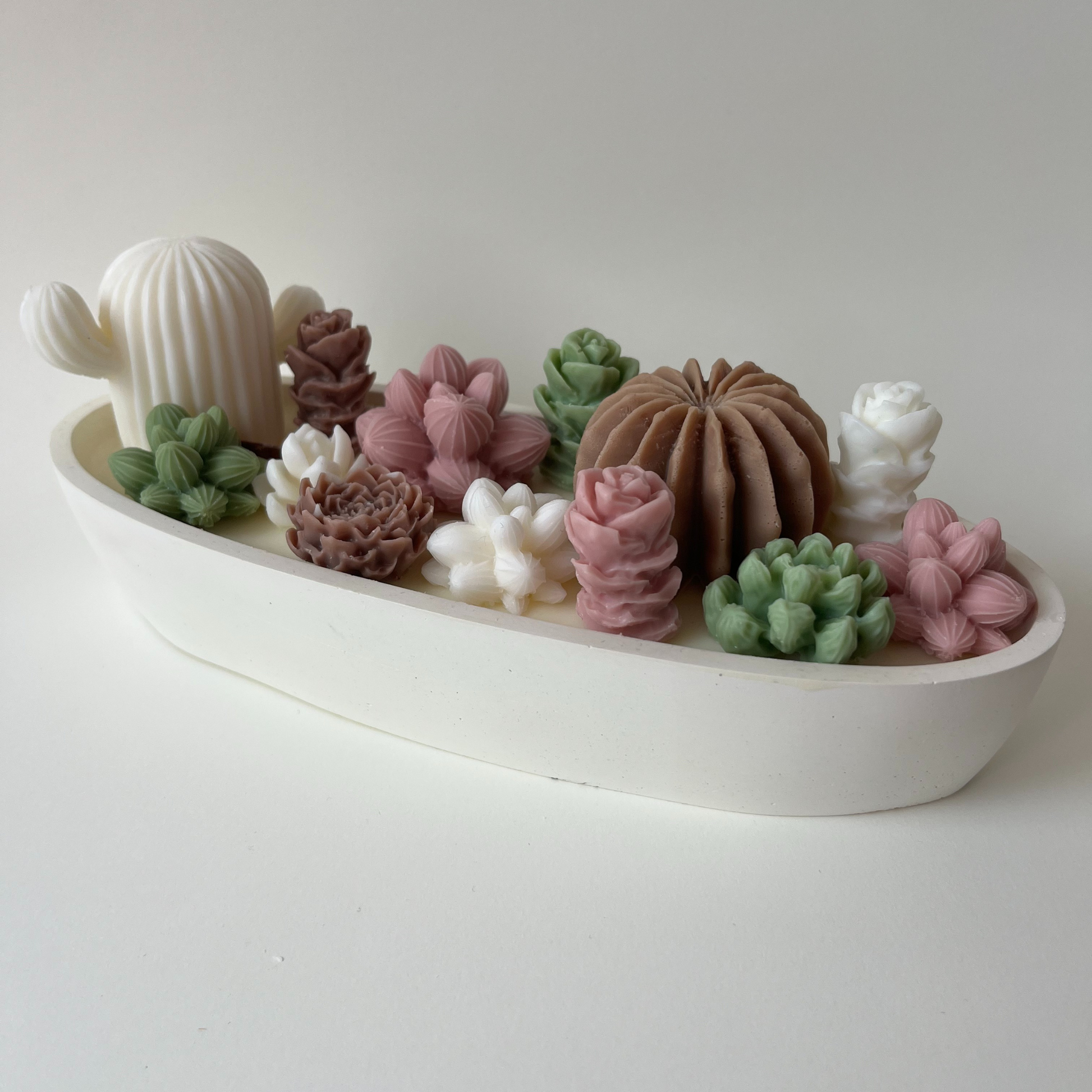 Imponente, delicada y llena de detalles que enamoran. Esta vela XL combina lo mejor de la naturaleza y el diseño: suculentas y cactus hechos a mano sobre una base amplia de cera de soja, acompañados por tres mechas de madera que al encenderse crepitan como un pequeño fuego de hogar.